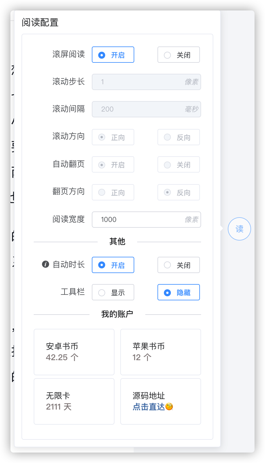 微信读书WEB端自动阅读插件为微信读书官网提供了丰富的阅读配置选项,读者可以随时开启或关闭滚屏阅读模式,具体的滚动步长、滚动间隔、滚动方向和阅读宽度均支持自定义,还可以在滚动到当前页面底部后执行自动翻页。