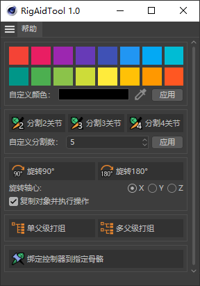 RigAidTool(C4D三维角色绑定辅助工具)能够将控制器绑定到角色模型的指定骨骼,为了便于识别,此插件支持使用任意颜色对空白、关节以及样条对象进行高亮显示。它支持将一个完整骨骼分割为多个关节,分割数量支持自定义修改。