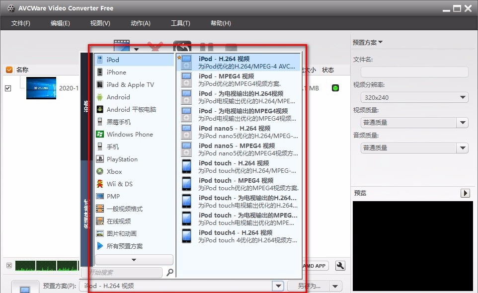 AVCWare Video Converter Free提供了大量关于视频格式转换的预置方案,每个方案均针对特定的视频格式进行了属性优化,可以直接拿来使用。此软件支持转换流行的AVI或MPEG格式,同时还可以快速转换YUV、NSV之类的少见格式。
