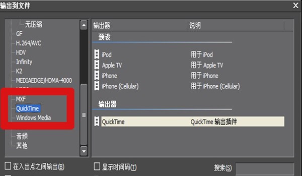 2、翻开输入到文件对话框,在场景布局左边找到我的预设选项,点击【QuickTime】,