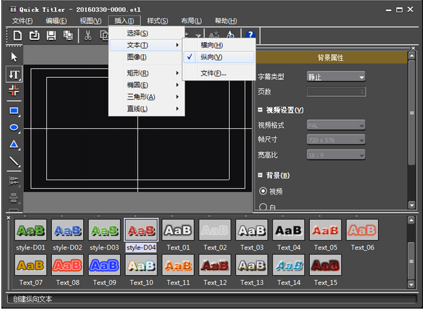 2、点击在1T轨道上建立字幕,则翻开Quick Titler字幕属性对话框,选择拔出文本纵向,左边的T操控键位左边就多了一个向下的箭头,暗示字幕标的目的;