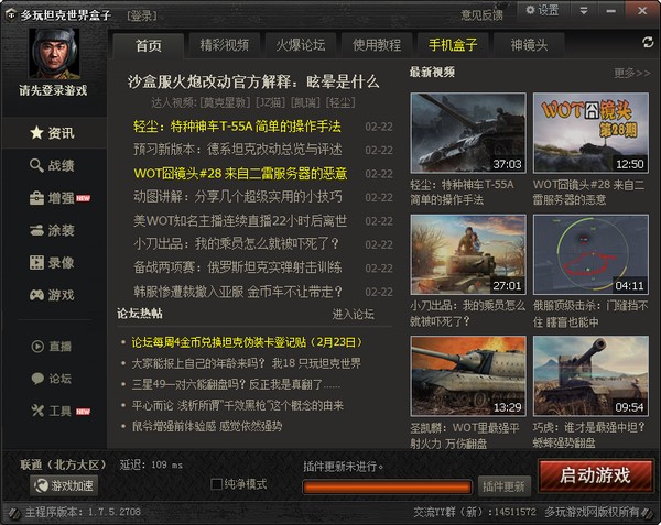 坦克世界盒子专门为喜爱坦克类游戏的玩家服务,它集合了战绩查询、属性增强、车辆涂装、游戏录像等辅助功能。在该工具的主界面中,您可以一键启动游戏、一键加速,还可以迅速更新游戏的相关插件。