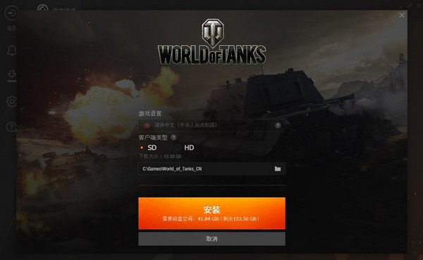 【步调三】在平台下载装载完成后,弹出坦克世界装载场景布局。玩家可以设置坦克世界游戏客户真个装载途径,默许装载约42G的SD版本(标清);也能够点击设置选择装载约66G的HD版本(高清)。
