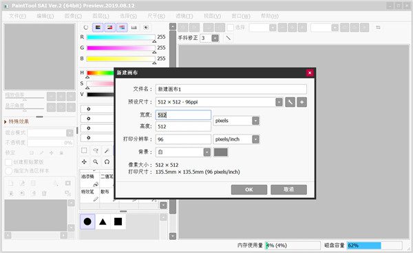 步调一:翻开电脑上已装载好的SAI软件,并新建一个合适的画布;