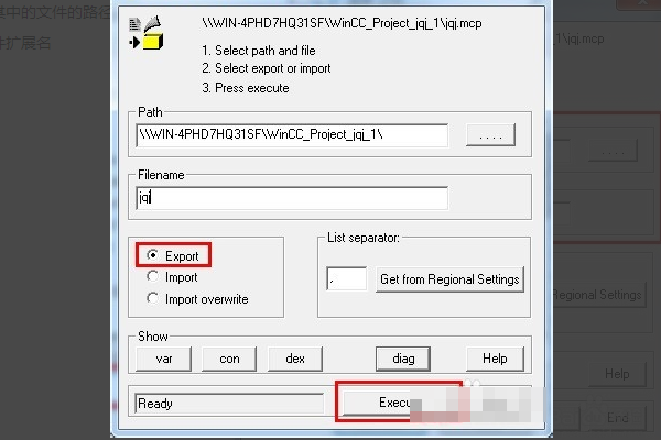 4、将形式设置为Export,单击Execute操控键位,确认动静框中的条目。