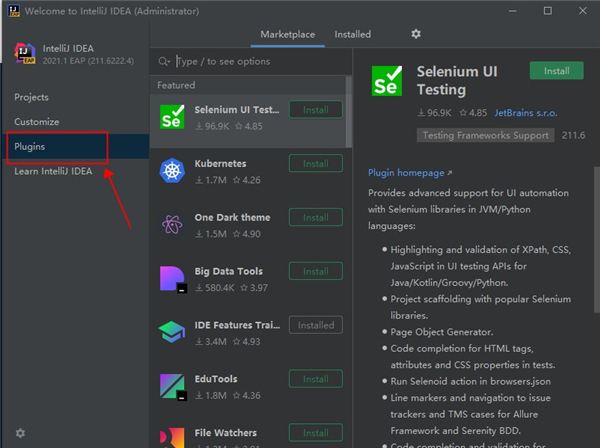 ②选中Plugins(插件),在搜刮框输出Chinese,然后找到Chinese (Simplified) Language ,点击install开启装载