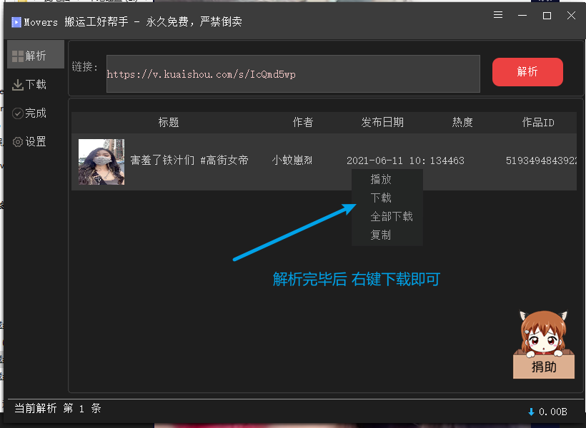 movers主打的正是短视频平台作品的一键解析下载服务,打开程序之后输入自己需要下载内容的指定链接,其次就是看页面呈现的短视频标题,作者,日期以及热度等信息是否能够对应上,没有问题导入到队列以后就可以完成极速下载,整体的搬运解析任务做的不错,也可以选择是否保留平台水印。