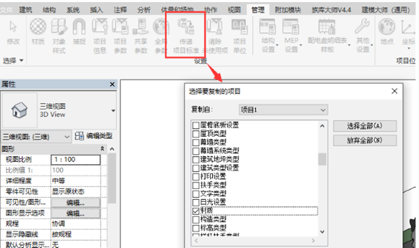 若是想将一个项目标材质复制到另外一个项目时,可以经由办理-通报项方针准来完成