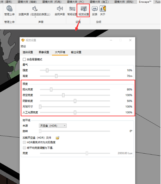 Enscape中没有直接加入光源的性能,需求经由revit直接加入光源或加入带有光源属性的构件。可在视觉设置-大气设置-照度一栏中重置Enscape场景内的一切光源。