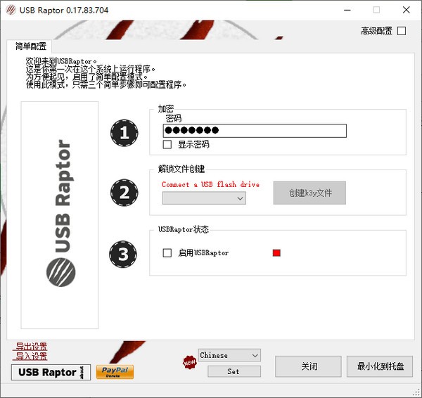 USB Raptor(USB设备控制电脑)能够把普通U盘改造成电脑的解锁钥匙,只有插入正确的U盘时才可以自动解锁电脑。为了避免U盘失效造成的不便,此工具还支持设置备用解锁方案,例如向电脑发送网络解锁消息或设备密码。