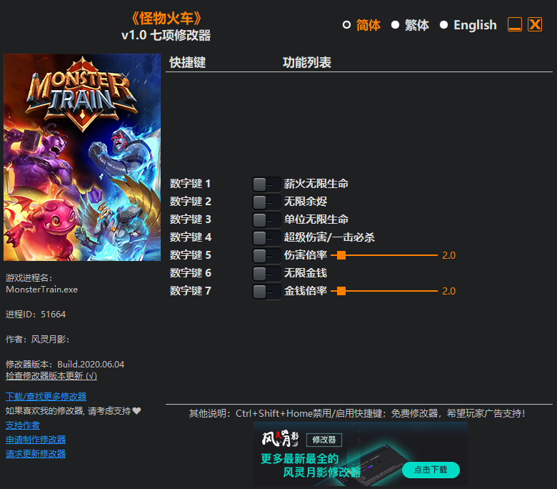 怪物火车七项修改器风灵月影版