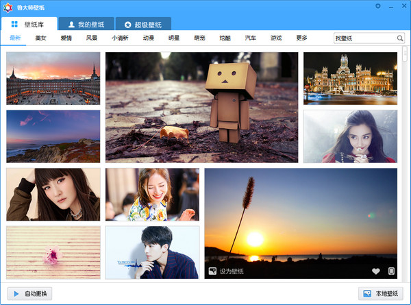 鲁大师壁纸是知名软硬件测评站点鲁大师官方的拓展业务软件,安装启动后第一眼就会觉得没有自家其他软件来的那么混杂,尤其页面也只是联网更新了大量分类壁纸,同步所有的壁纸也会随时进行页面内容调节,大家根据自己的喜好去搜索下载,保存历史记录,便于脱网情况下也可以借助于这些资源随即更换。
