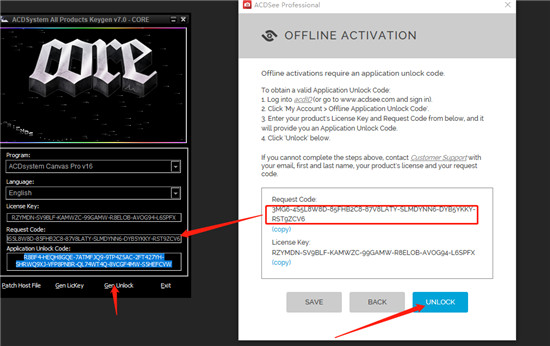 10、将软件中的request code复制到注册机中,并点击gen unlock取得unlock code