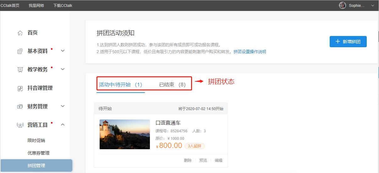 教员可以按照本身的需求设置拼团时效,在响应时间内,若是学员倡议的或插手的某个团没有拼成功,则会主动退款,学员可以从头倡议新的团或再插手其它的团。