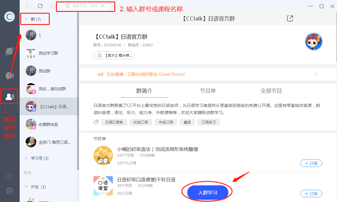 登录CCtalk,点击左边的通信录-群-找到所采办的课程,或在搜刮框中输出群号、群称号查找,点击入群进修便可。