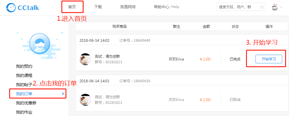 登录CCtalk官网-我的定单中查询,找到采办的群并点击入群进修,系统会主动调起CCtalk客户端并进入到响应的群中。