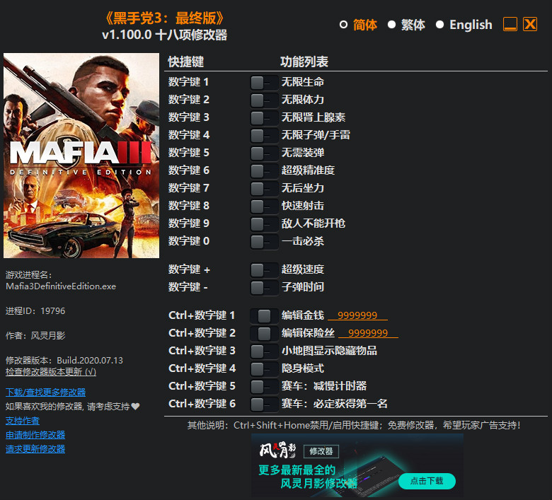 喜欢小编为你带来的《黑手党3》十八项修改器风灵月影版吗,喜欢的话就行动起来吧,你能在这里看到简单易懂的游戏辅助工具,你还能够在这里找到更多功能强大的辅助工具,让你一个新手也能够畅玩该游戏,欢迎你来游戏爱好者瞧一瞧!