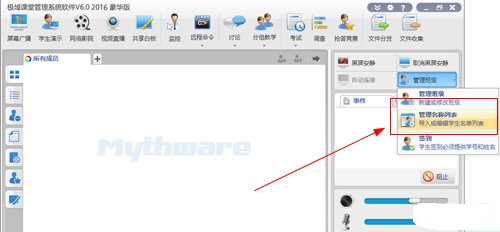 1、翻开极域讲堂办理系统教员端,点击软件右侧的办理班级性能操控键位,以后点击办理称号列表便可。