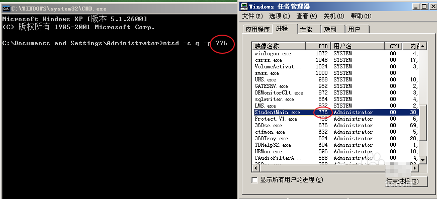 7、在节制台里输出ntsd -c q -p "PID" PID就是StudentMain.exe的标识号。点击回车以后就可以顺遂加入了。
