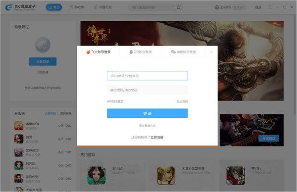 1、双击“飞火游戏盒子”进入游戏登录场景布局,输出账号及密码开启登录,可以拥有账号密码登录与短信登录两种技巧,别的,还拥有微信、QQ品级三方账号登录。