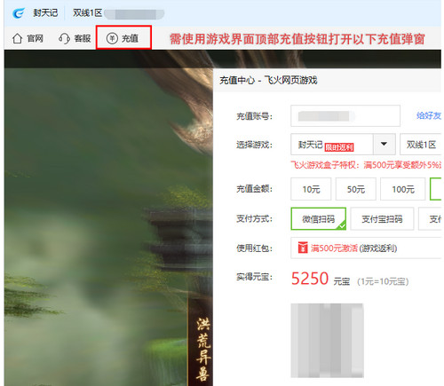 盒子特权返利前提?运用飞火游戏盒子享用特权返利同时需完成以下前提:1) 运用飞火游戏盒子三周年版,经由点击游戏场景布局顶部“充值”操控键位运用充值性能: