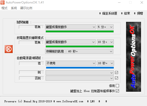 AutoPowerOptionsOK 的设置分为两个部门,上半部门是用来设置鼠标或键盘没有举措的话,就封闭展示器或将系统进入休眠状况。而下半部门,则是当鼠标或键盘有举措时,就切换到特定的电源打算,或其他的电源打算。