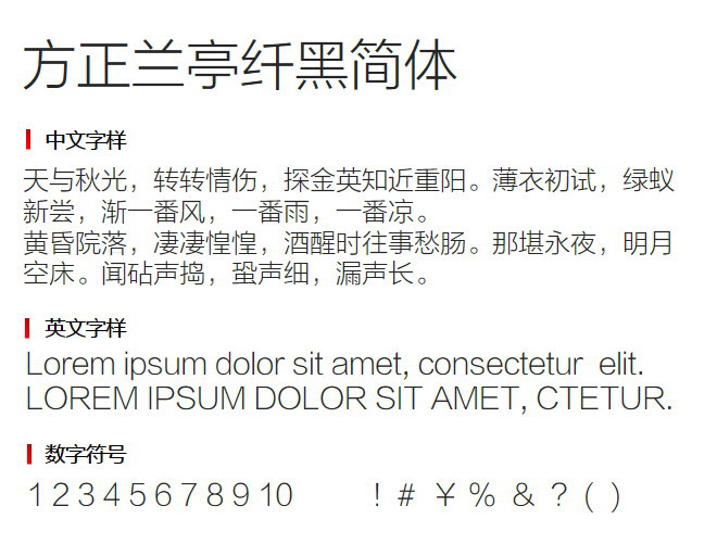 结构端正,整体看上去更大方,气质更突出,方正兰亭纤黑简体结构更清晰,整体看着更觉稳重,更得体,字形更美观,也更漂亮。笔画均衡,整体看上去更显端庄,也更雅致,给人留下的印象更好,整体风格更时尚,设计更简约,看着更觉清爽。