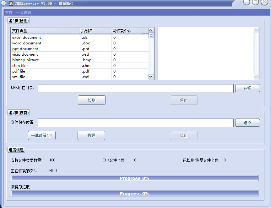 CHKRecovery是一款绿色玲珑、性能适用的CHK文件误删复原软件,是专为CHK文件被删除的用户而设的CHK文件恢停工具,我们还采取了国际顶尖的恢复功能。内置具体的运用导游,第一步检测、第二步恢复、第三部检查恢复的进度。它可以在电脑系统中迅速恢复并找回chk文件,并且拥有不同文件超一百种,并且主动辨认恢回复复兴来文件格局,性能厉害适用,用户只需选择CHK文件的目次,点击检测后便可恢复完成。我们首要针对用户们不谨慎误删文件,所以我们才会操纵这款CHKRecovery来将这些CHK文件复原,而且还可以在电脑系统中迅速恢复并找回chk文件,拥有不同文件跨越一百种,默许后缀名为.xls、.doc、.ppt、.vsd、.bmp.、chm、.pdf、.xml的文件都可以恢复。