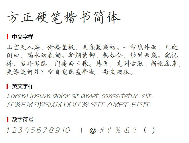 风格大气,重心略向左倾,右侧更舒展,呈现出的视觉效果更佳,也更惊艳,方正硬笔楷书简体笔画更显硬朗,整体更严肃,棱角较为分明。线条粗细适中,整体看着更和谐,不会出现丝毫违和,字形更飘逸,不会显得过于死板,让你感受到该字体的灵动。
