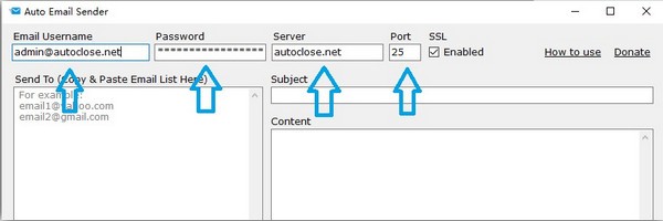 第一次使用此工具时,请按照提示填写自己的邮箱用户名、邮箱密码、电子邮件服务器和端口,然后发送到的邮箱地址,既可以逐个键入,也可以从已有的联系人文档中复制粘贴。用户可先尝试向第一个目标地址发送,待成功后再批量发送。
