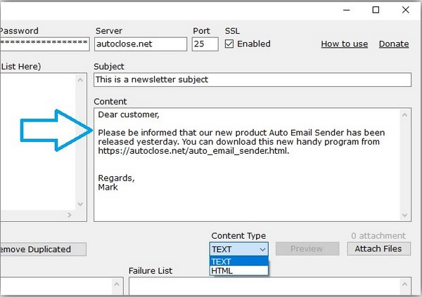 Auto Email Sender(自动邮件发送器)能够加快邮件的批量发送过程,用户可自行编辑邮件的标题、正文内容,然后从TEXT、HTML等预设选项中选择邮件类型,还可以点击“添加附件”,随邮件附带一个或多个文件。