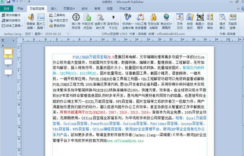 性能面向文字处置、数据转换、编纂计较、清算排版、工程解密、段落加解密、拔出特别符号、批量改图片大小、每页转图片文件、内容转图片(制止编纂)、批量图片格局转换、批量缩放图片、繁简及内码转换、GB2转BIG5、BIG5转GB2、图片批量导入、图片批量导出、批量导图入表格、肆意截图东西、截图小精灵、语音朗诵、一键关机、一键开机等运用,为Publisher必备东西箱之利器。