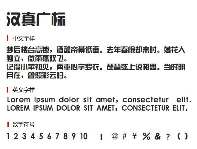 字形端庄,风格大气,笔画较粗,视觉效果更醒目,让你一眼就被汉真广标所吸引,注意到该字体的不同之处,发现该字体较为独特的风格。边角较为圆润,整体更显可爱,更显活泼,不会显得死板,让你能从字里行间中感受到该字体展现出来的活泼气息。