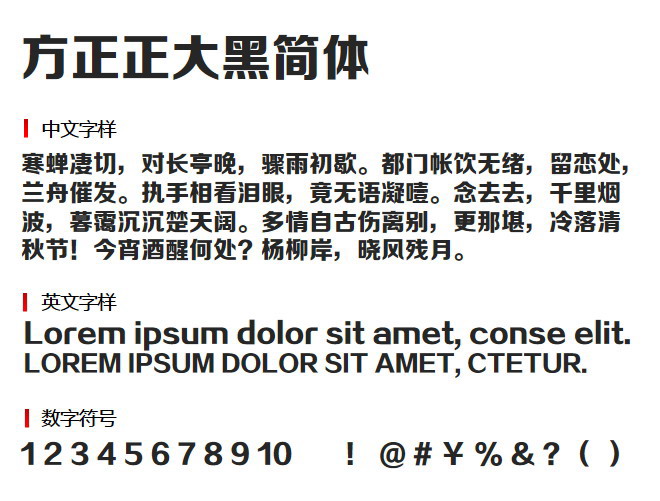 结构端正,整体更显端庄,字体比例设计更合理,整体看着更觉舒服,笔画设计方式更独特,设计形式是多样的,不同的笔画采取不同的处理方式,方正正大黑简体整体更显大气。外形美观,风格大气,看着更觉大方,也更得体,给人留下的印象更好。