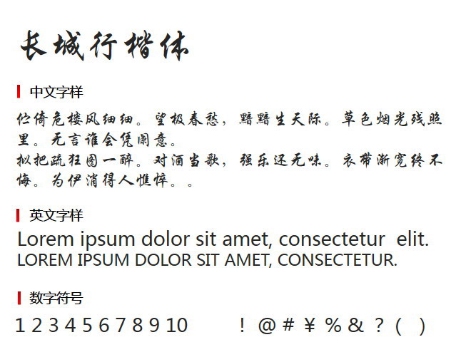 行笔更自由,更潇洒,没有任何约束,结构端正,整体更显端庄,长城行楷体融合了行书与楷书的优点,整体看上去更显洒脱,但是结构却不显得松散,整体更和谐。外形美观,笔画飘逸,书写起来更流畅,也更恣意,书写更自由,你可以将该字体用在不同的场合上面。