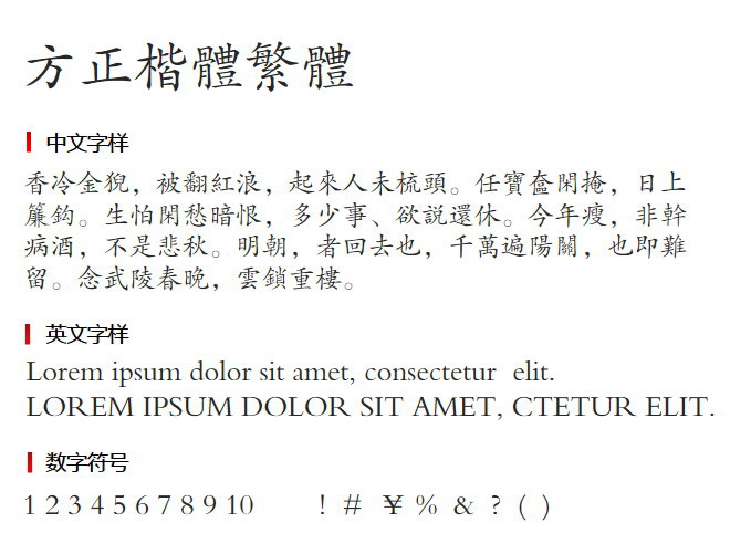 结构严谨,更显端庄,字面较大,视觉效果更醒目,中宫放松,整体看上去更舒展,不会显得过于紧凑,整体更和谐,看着更舒服,方正楷体繁体灰度均匀,看着更美观,界面更干净,整体看着更清爽。结构分明,笔画讲究,书写出来更显工整,书写出来也非常规范。