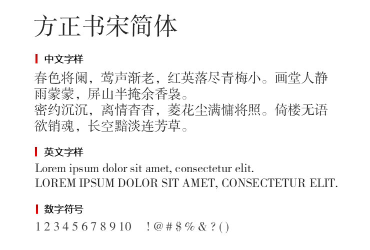 结构严谨,更显端正,整体更显优雅,看上去更顺眼,更觉舒服,布局合理,整体更和谐,一点都不显得违和,方正书宋简体书写流畅,书写出来的效果更自然。笔画清爽,看着不费眼,呈现出更佳的视觉效果,字形秀丽,风格清新,外形方正,整体看上去更规矩。