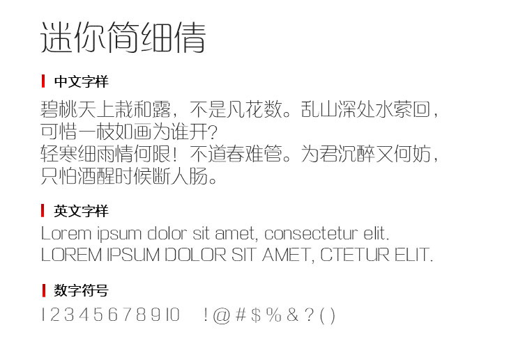 外形美观,笔画简单,整体看上去更优雅,线条纤细,字形更挺拔,整体看着更舒服,布局合理,更觉和谐,看着一点都不费眼,给人的感觉更好。迷你简细倩笔画纤细,笔迹清晰,笔画走向看得更清楚,书写起来更流畅,书写出来的效果更工整,也更自然。