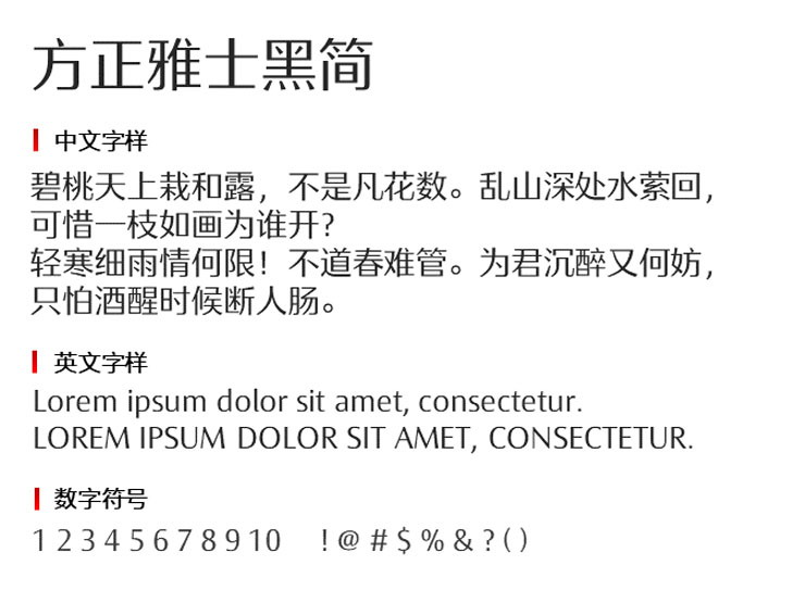 笔画简洁,书写起来更方便,书写出来的效果也更自然,结构严谨,字形端正,方正雅士黑简呈现出的视觉效果更佳,更显工整,书写出来更觉规矩。字形方正,书写讲究,书写出来更规范,整体看上去更优雅,更显大方,看着非常得体,给人留下的印象更好。