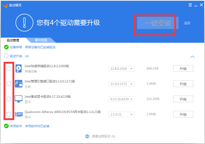 3、可以看到检测出,一切的软件都已装载,有四个驱动需求进级