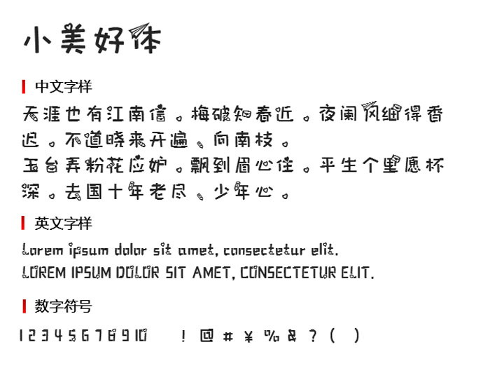 风格清新,修饰元素更多,布局合理,整体看上去更和谐,一点都不违和,呈现出更佳的视觉效果,你会在小美好体中看到更多美好的元素,呈现出浪漫的效果。字形简单,修饰元素更丰富,该字体在文字中融入了一些图案,整体看上去更特别,特点更突出。