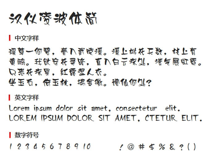 造型独特,整体看上去更有个性,设计风格独特,设计更加巧妙,结构灵动,整体看上去更活泼,一点都不显得死板,看上去更有活力,更觉精神。汉仪凌波体简表现形式更加夸张,整体看上去更可爱,也显得更活泼,展现出孩子的天真,处理方式更多样,特点更突出。