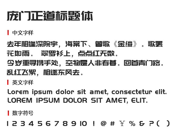 结构严谨,造型端正,整体看上去更大方,也非常得体,呈现出更佳的视觉效果,笔画平直,书写起来更讲究,书写出来更显工整,整体看上去更大气。庞门正道标题体笔画均衡,风格更时尚,紧跟时代潮流,一点都不过时,外形方正,笔画圆润,将刚与柔结合得更好。