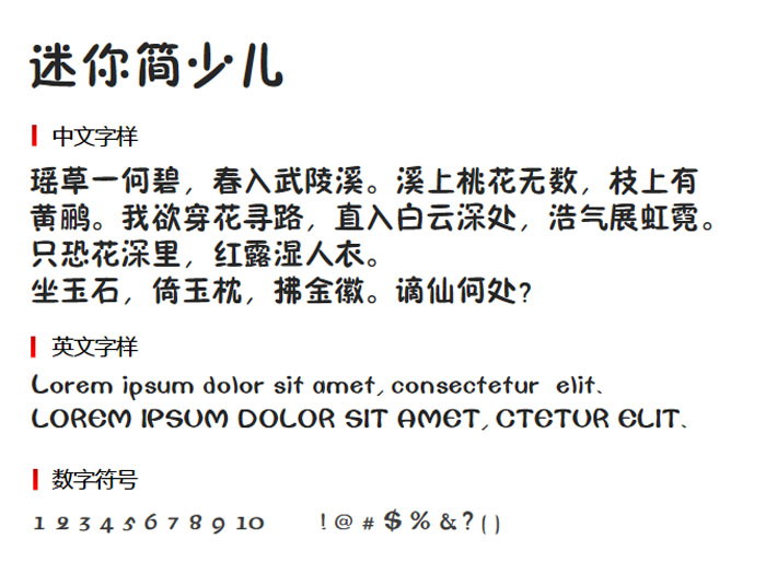 外形可爱,结构活泼,整体看上去更灵动,一点都不显得死板,整体看上去更精神,给人的感觉更舒服,迷你简少儿笔画简洁,书写起来更流畅,书写出来的效果更佳。结构清晰,笔画走向看得更清楚,书写起来更方便,书写出来的效果更自然,识别起来更方便。