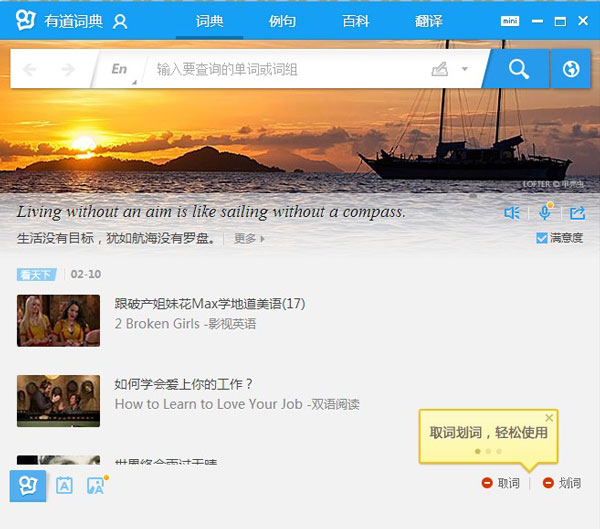 有道辞书连系了互联网在线辞书和桌面辞书的优势,拥有中、英、法、日、韩五种说话,不但供给惯例的英汉、法汉、日汉、韩汉互译和汉语辞书和全文翻译的性能,还收录了各种辞汇的收集释义,例句和百科常识。除此以外,有道辞书的取词划词还融会了指导释义,除供给惯例的翻译外,还会同时供给给用户更多资讯,包罗旧事、影视资讯、百科、人物等。