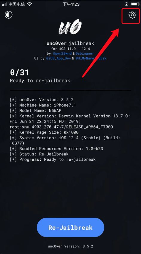 翻开 unc0ver 逃狱东西,点击右上角齿轮操控键位进入设置。
