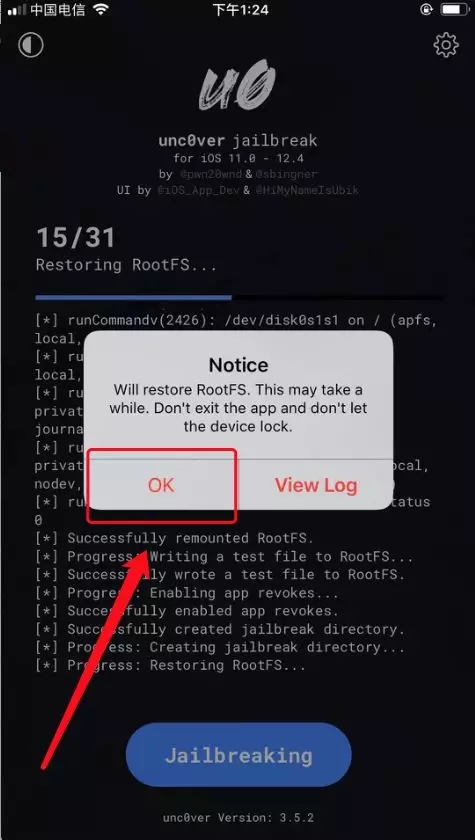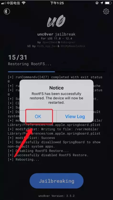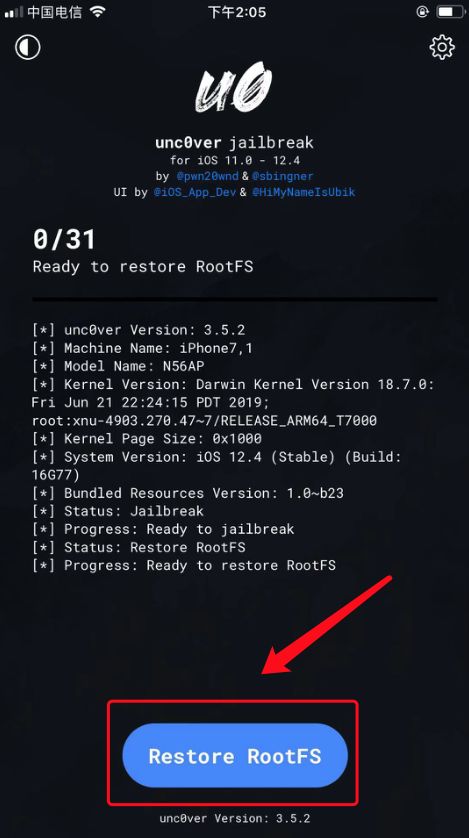 前往 unc0ver 主页面,此时下方蓝色操控键位将会酿成Restore RootFS。