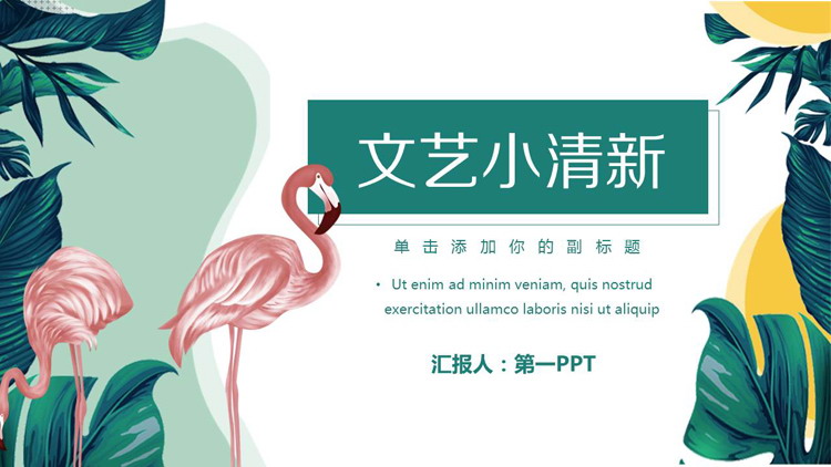 色彩更鲜艳,呈现出的效果更醒目,让人一眼就注意到该模板,吸引到更多人的视线,色彩组合更和谐,整体看上去更舒服,看着不觉得违和。绿色叶子与红色火烈鸟背景的小清新PPT模板配图更清新,整体看上去更清爽,一点都不费眼,看着更有文艺范,更觉清新。