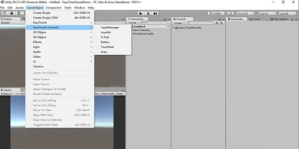 1、导入进项以后会在GameObject下拉菜单中呈现响应的选项列表EasyTouch Controls,EasyTouch。