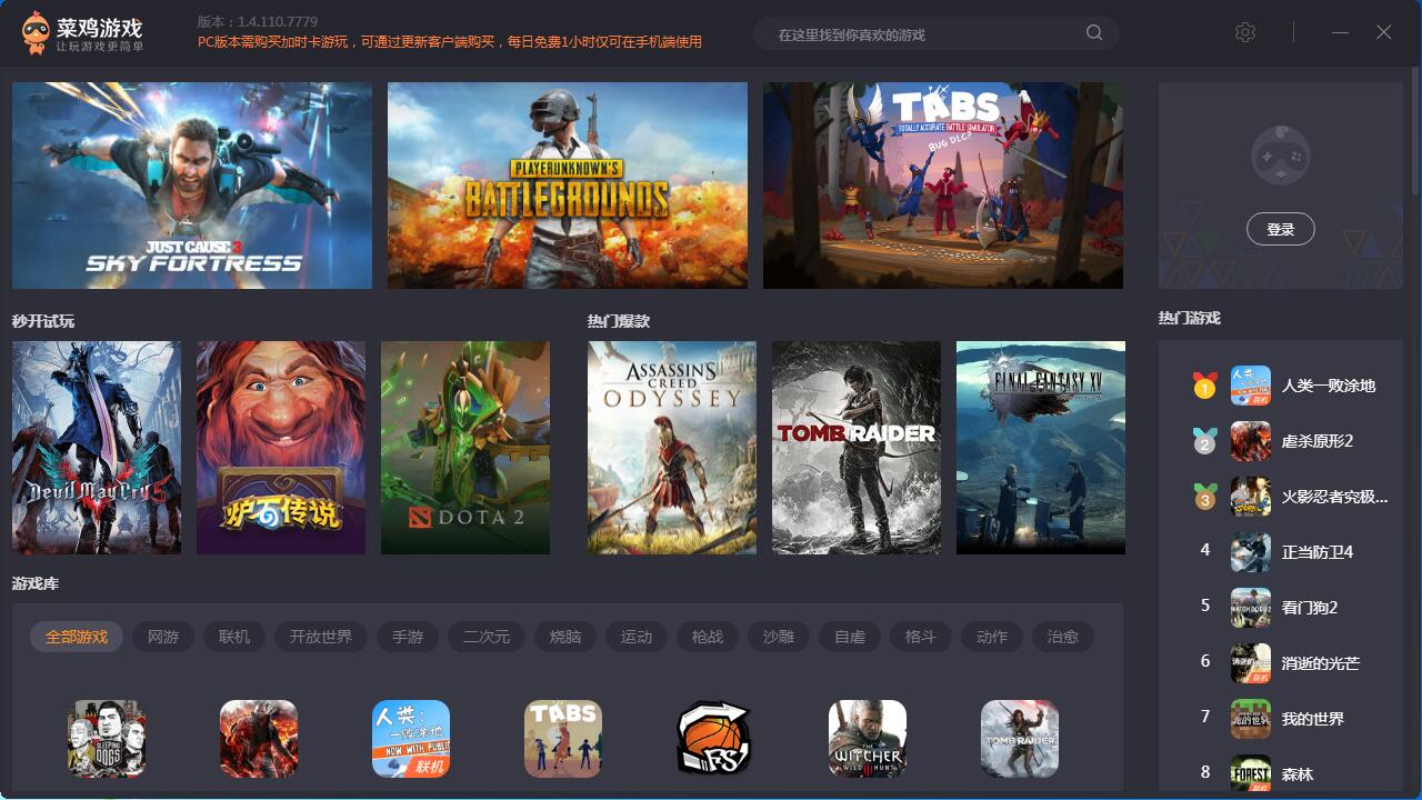 1、菜鸡游戏电脑版是一款超等好玩的游戏云平台,为你供给更多乐趣,望文生义,就算你是菜鸡也能够在电脑上欢愉的玩游戏!直接在电脑上便可以玩端游,蓝光画质运转顺畅,给你各种不同的游戏体验!